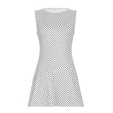 Featuring classic white polka dots on navy blue, this chic sleeveless piece boasts a flattering tailored waist, balancing elegance and comfort. The boat neck adds sophistication, while the lightweight, breathable fabric keeps things comfortable and effortless.